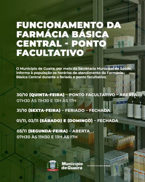 Guaíra – Farmácia Básica Central divulga cronograma de funcionamento no ponto facultativo e feriado