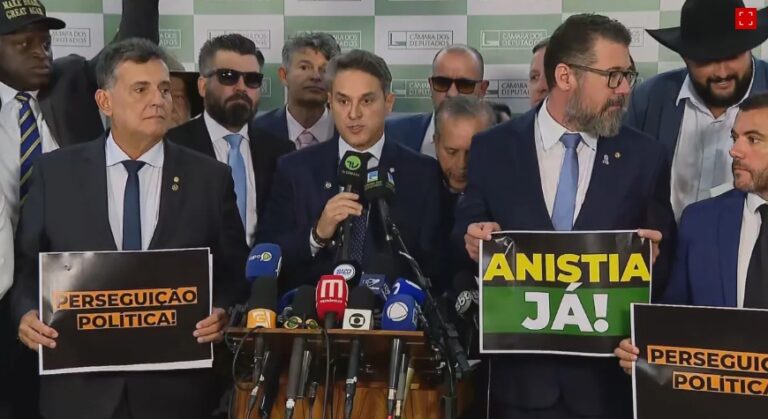 Durante a leitura do manifesto apresentado por Zucco, os parlamentares exibiram cartazes sobre “perseguição política” e pedindo a anistia de condenados por participar dos atos criminosos de 8 de janeiro de 2023.
