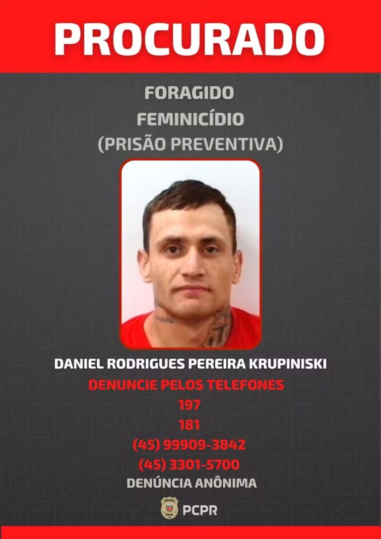 A Polícia Civil do Paraná divulgou a foto de Daniel Rodrigues Pereira Krupiniski, de 24 anos, suspeito de matar a facadas a própria esposa, Mayara Araújo Krupinski Rodrigues, de 31 anos. O filho da vítima, de 5 anos, presenciou o assassinato da mãe.