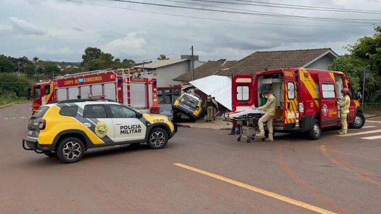 Trânsito – Viatura da PM bate em Corolla, atinge ponto de ônibus e casa em acidente em Cascavel
