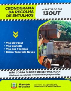 Guaíra – Município divulga próximos bairros que receberão a coleta de entulhos entre os dias 13 e 16 de Outubro