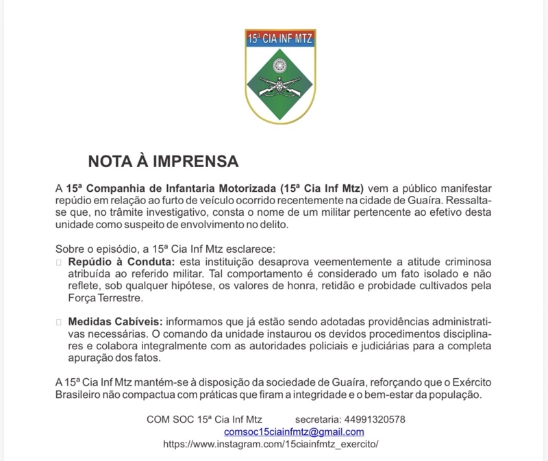 A 15ª Companhia de Infantaria Motorizada (15ª Cia Inf Mtz) divulgou nota oficial manifestando repúdio ao furto de um veículo ocorrido recentemente aqui em Guaíra. De acordo com o comunicado, no curso das investigações consta o nome de um militar da unidade como suspeito de envolvimento no crime.
