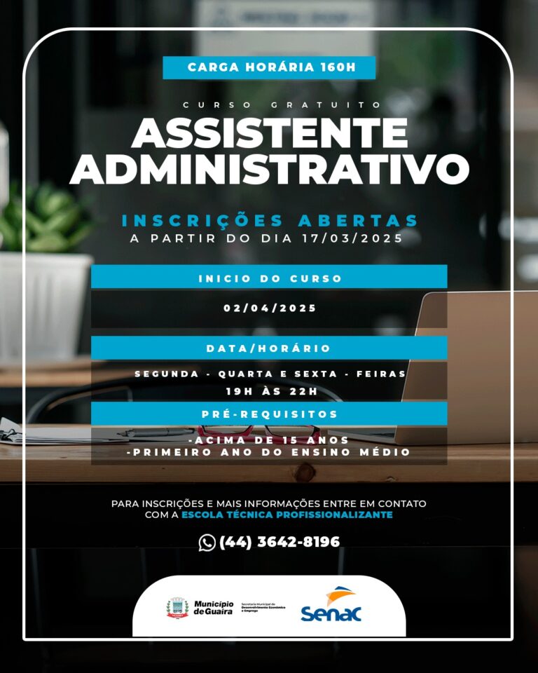 O Município de Guaíra, por meio da Secretaria Municipal de Desenvolvimento Econômico e Emprego (SEDE), informa que as inscrições para o curso gratuito de Assistente Administrativo, estão abertas.