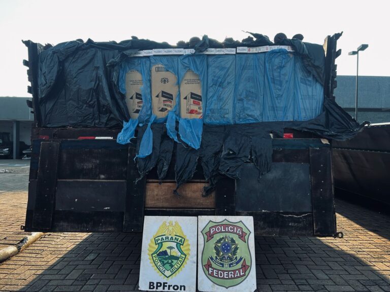 Na segunda-feira (21), a Polícia Militar do Paraná, por meio do Batalhão de Polícia de Fronteira (BPFron), na vigência da Operação Protetor de Divisas e Fronteiras, numa ação integrada com a Polícia Federal (NEPOM), durante patrulhamento no interior de Mercedes, as equipes localizaram um caminhão Ford F600 carregado com aproximadamente 120 caixas de cigarros paraguaios, totalizando cerca de 6 mil pacotes do produto ilícito.