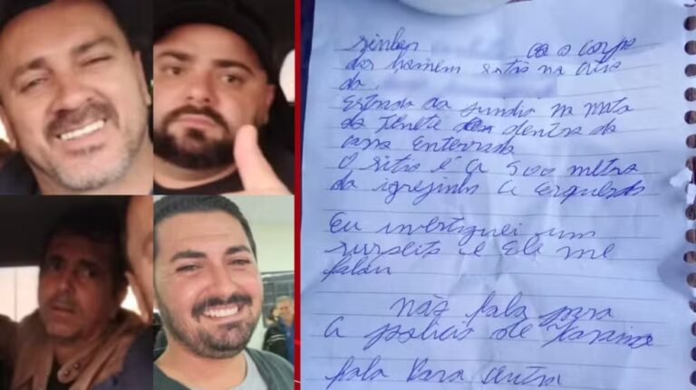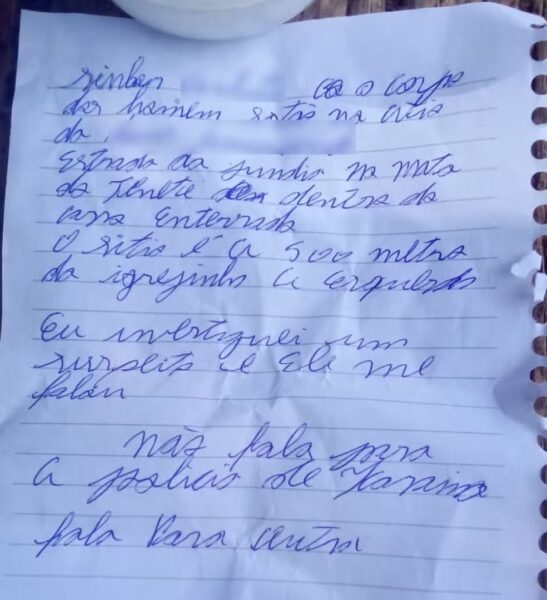 A carta diz que “os corpos dos homem [sic] estão no sítio […], Estrada da Jundiá na Mata do Tenente dentro do carro enterrado. O sítio é a 500 metro [sic] da igrejinha a esquerda. Eu investiguei um suspeito e ele me falou”.