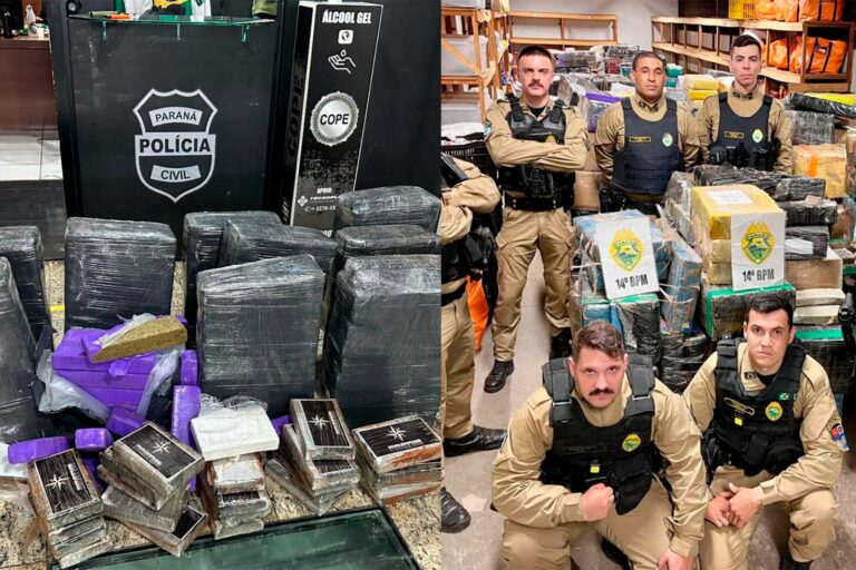 Somente as apreensões de maconha e derivados (haxixe, skunk e sementes) no Paraná somaram 753,4 mil kg, 39,6% de todo o volume do País. A maior parte foi retirada de circulação pelas forças estaduais de segurança, que em 2024 apreenderam 483,7 mil kg da droga, um aumento de 12,9% em relação a 2023 (428,4 mil kg) e o segundo maior volume entre os estados. Além disso, as forças estaduais apreenderam 5,8 mil toneladas de cocaína no ano passado, 29,2% a mais do que em 2023.