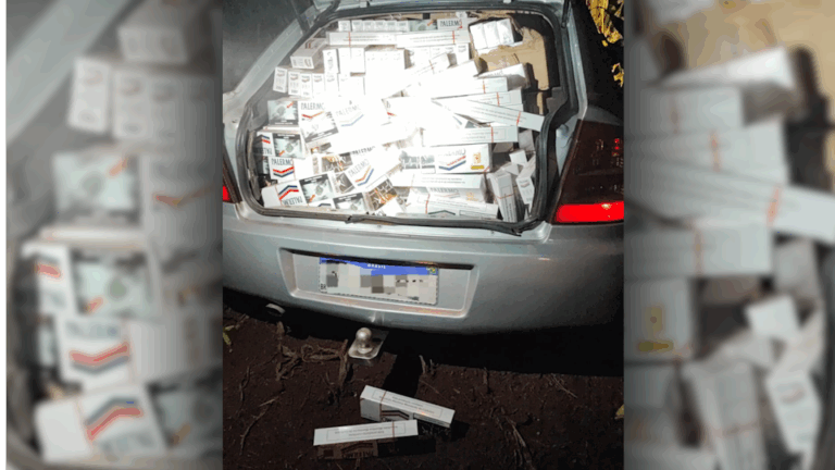 Dentro do carro estavam 1.250 pacotes de cigarros vindos do Paraguai. O veículo e a carga foram levados até a delegacia para os procedimentos.