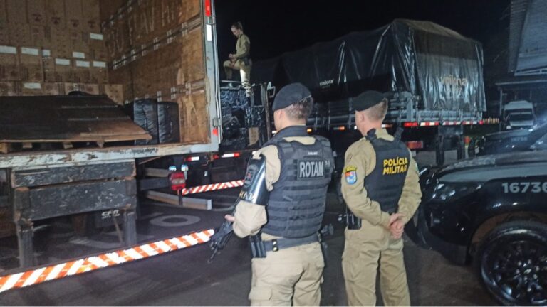 Três caminhões foram apreendidos em propriedade rural de Toledo, na noite de terça-feira (13). Dois deles estavam carregados com cerca de 650 caixas de cigarros estrangeiros – o equivalente a 32.500 pacotes.