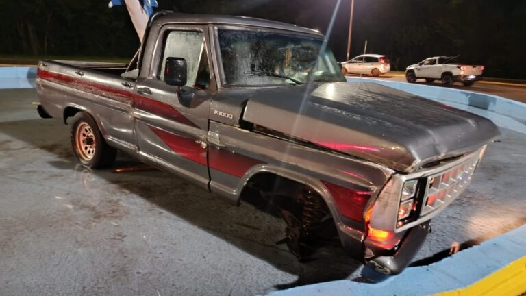 A caminhonete Ford F1000, com placas de Palotina, seguia pela Rua Alemanha quando o motorista perdeu o controle ao chegar na rotatória. O veículo subiu na estrutura do chafariz do golfinho e parou dentro da mureta.