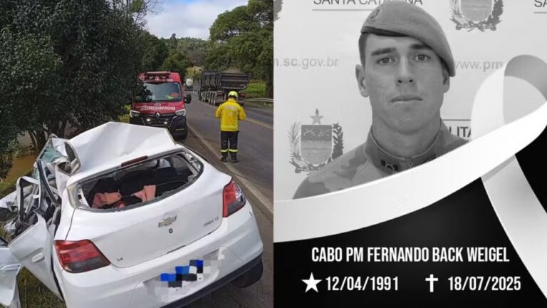 Com a força da colisão, o carro ficou destruído e o caminhão entrou parcialmente em um açude, informou o Corpo de Bombeiros Militar. O cabo Fernando Back Weigel, que morreu no acidente, atuava no batalhão da PM de Brusque, no Vale do Itajaí.