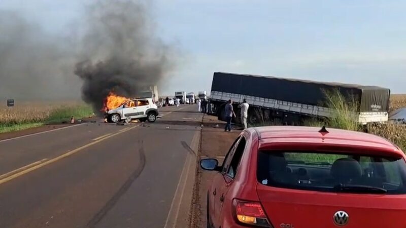 No vídeo, é possível ver um carro em chamas no meio da rodovia. Além do veículo de passeio, uma carreta e um caminhão furgão se envolveram no impacto.