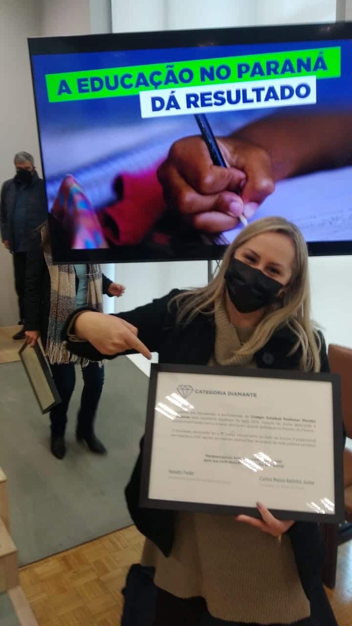 No evento ela recebeu o certificado ‘Diamante de Educação’, que foi entregue para diretoras e diretores de escolas dos 32 Núcleos Regionais de Educação da Rede Estadual de Ensino do Paraná.