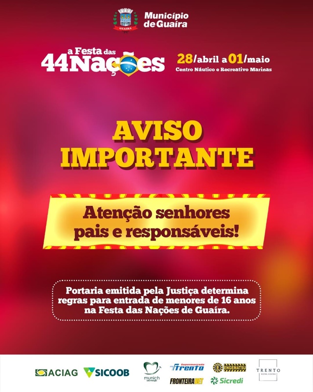 A portaria nº 13/2023 foi emitida pelo Juiz Substituto da Vara Criminal, Família e Sucessões, Infância e Juventude e Juizado Especial Criminal de Guaíra (PR), doutor Adeilson Luz de Oliveira, e determina que crianças e adolescentes menores de 16 anos não podem entrar na Festa das Nações sem estarem acompanhados pelos seus pais ou responsáveis.